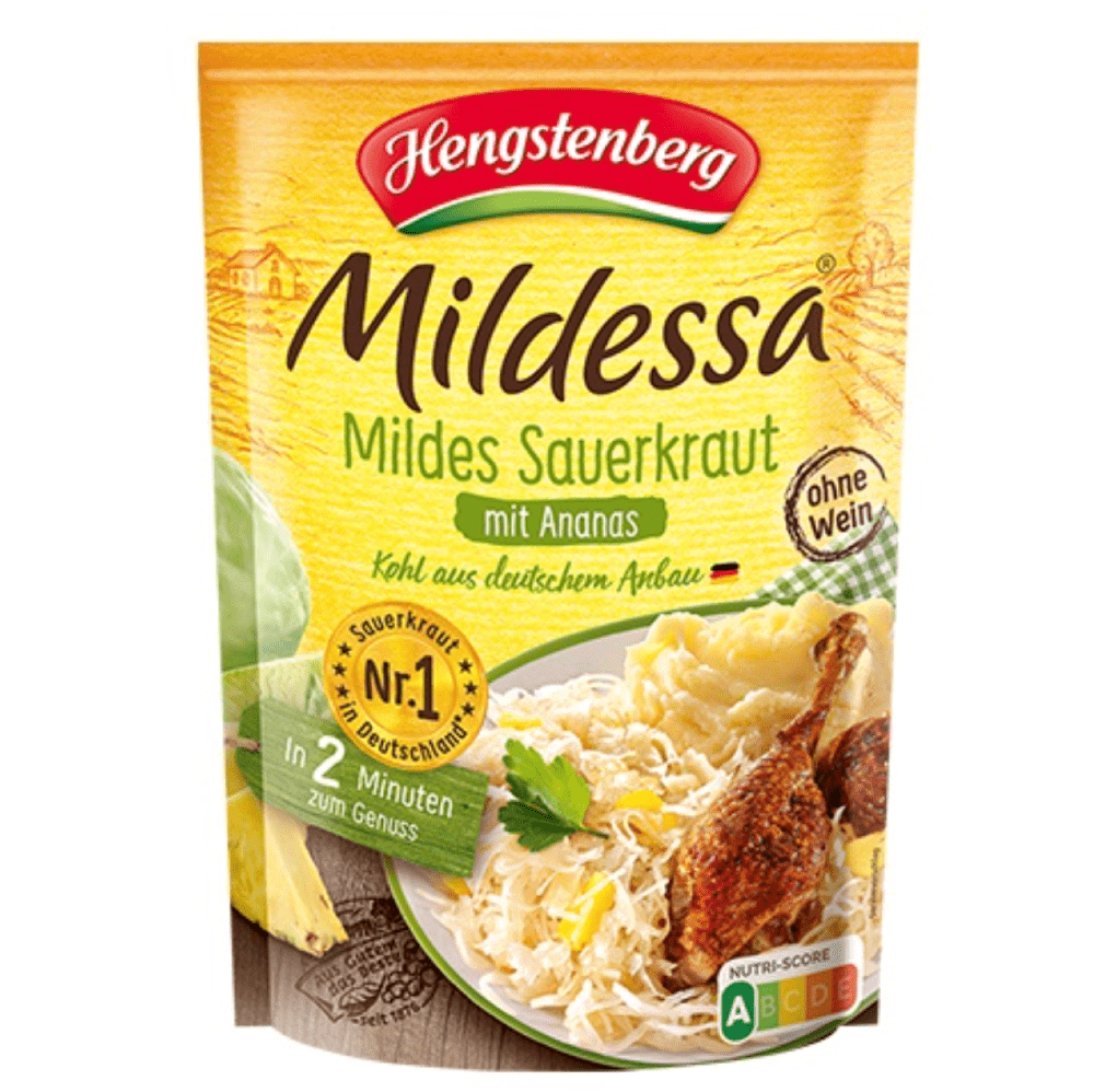 Hengstenberg Mildessa Sauerkraut with Ananas combines the classic tangy flavor of sauerkraut with the sweet, tropical taste of pineapple. This unique blend adds a refreshing twist to traditional sauerkraut,