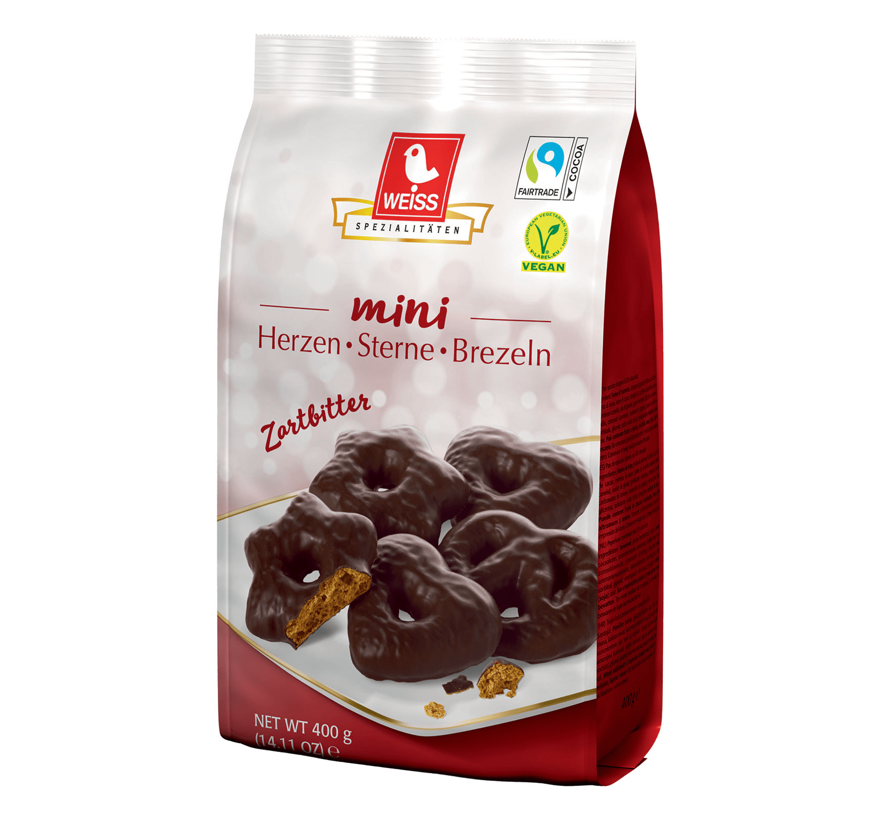 Introducing Weiss Mini Hearts/Stars/Pretzels Dark Chocolate! This delicious treat is the perfect combination of sweet and savory. The dark chocolate exterior is filled with a creamy white filling, making it a unique and indulgent snack.This Lebkuchen are made with the finest ingredients, ensuring a quality product every time. The perfect gift for any occasion, these treats are sure to please. Enjoy the unique flavor of Weiss Mini Hearts/Stars/Pretzels Dark Chocolate today!